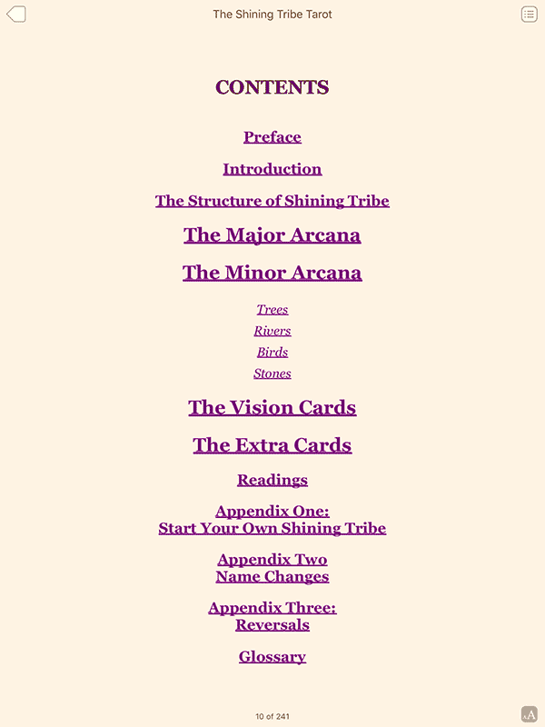 In Shining Tribe, the suits are renamed as Trees, Rivers, Birds, and Stones, and the royalty have become The Place, The Knower, The Gift, and The Speaker. The Major Arcana provides a map of the soul’s journey from birth to enlightenment, and the Minors show the kaleidoscope of human experience in all its varied forms.
