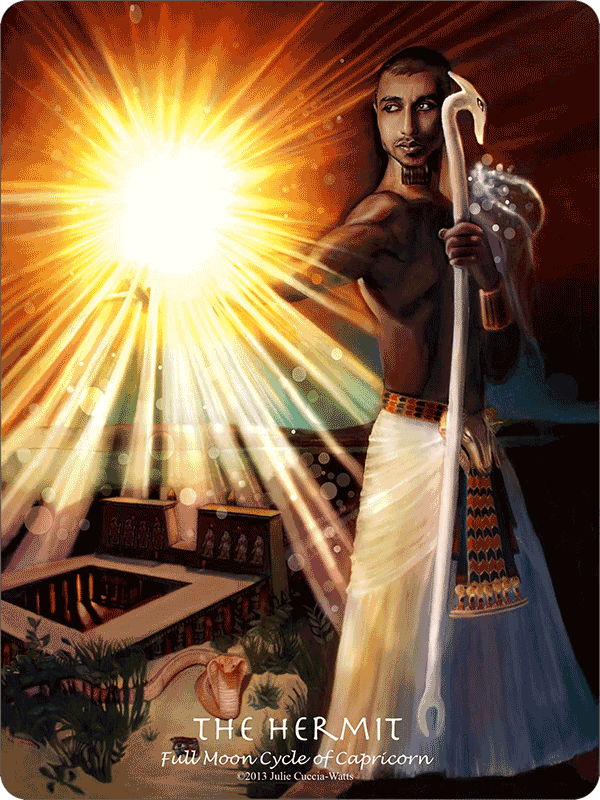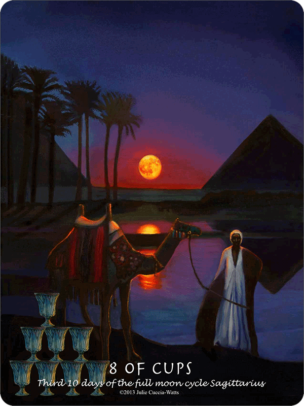 In Journey into Egypt, Julie Cuccia-Watts gives us multi-racial ancient Egyptian society depicted realistically. The deck includes images of early eras, as well as later periods during Greek and Roman rule. These exquisite Tarot cards echo well-known works of fine art and ancient architecture, deepening the deck’s artistic resonance. The sumptuously cinematic cards are accompanied by a detailed guidebook crammed with information both historical and visionary about ancient Egyptian culture. Journey into Egypt Tarot shows us wonders of ancient Egypt when the architecture was new and the paint was fresh. If you’ve ever longed to stroll Amun’s temple at Karnak, or to see the great Pharos of Alexandria lit at night, Journey into Egypt will transport you to the ancient Egypt of your dreams.