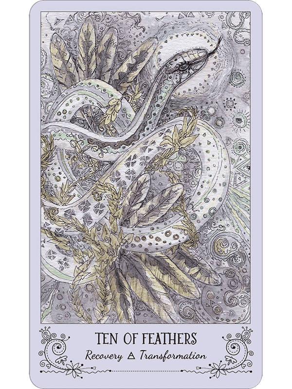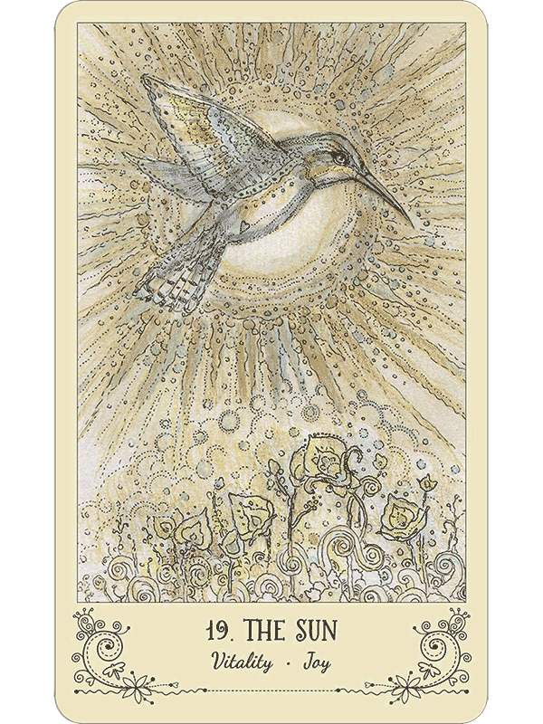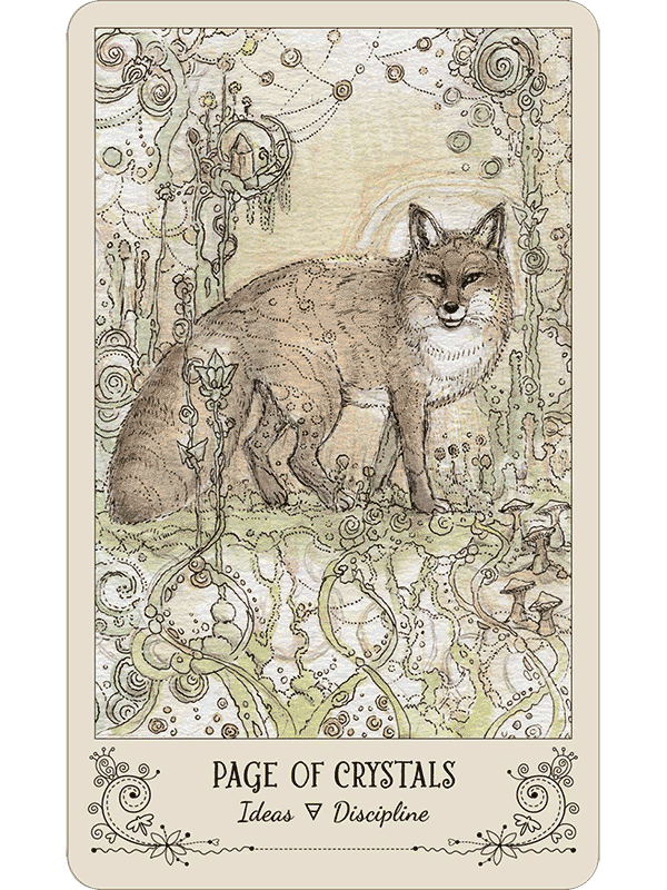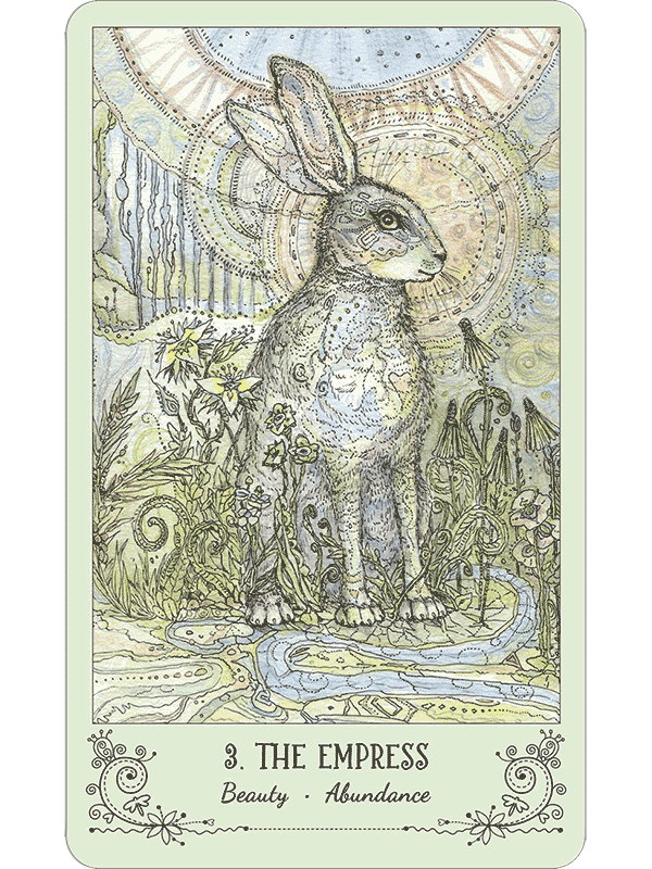 Paulina Cassidy has produced a lacy, delicate work, with the animal allies rendered in pastel colors. But do not underestimate Spiritsong Tarot’s power! Spiritsong’s animal messengers teach profound mysteries gently, always choosing to inspire rather than to intimidate.