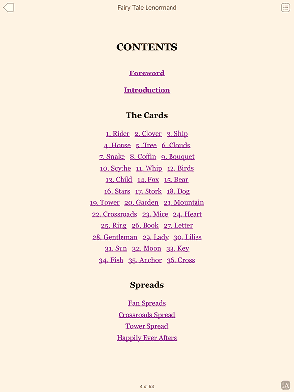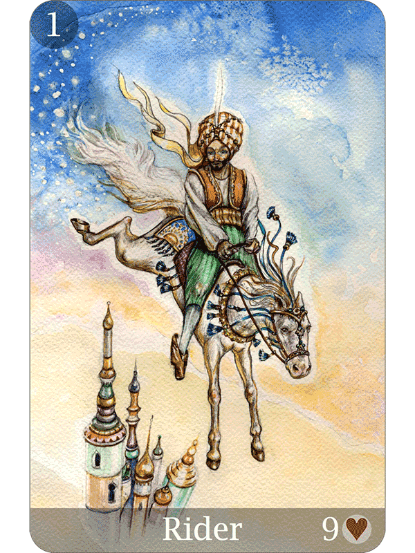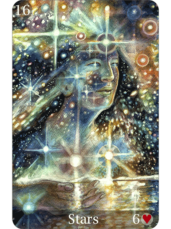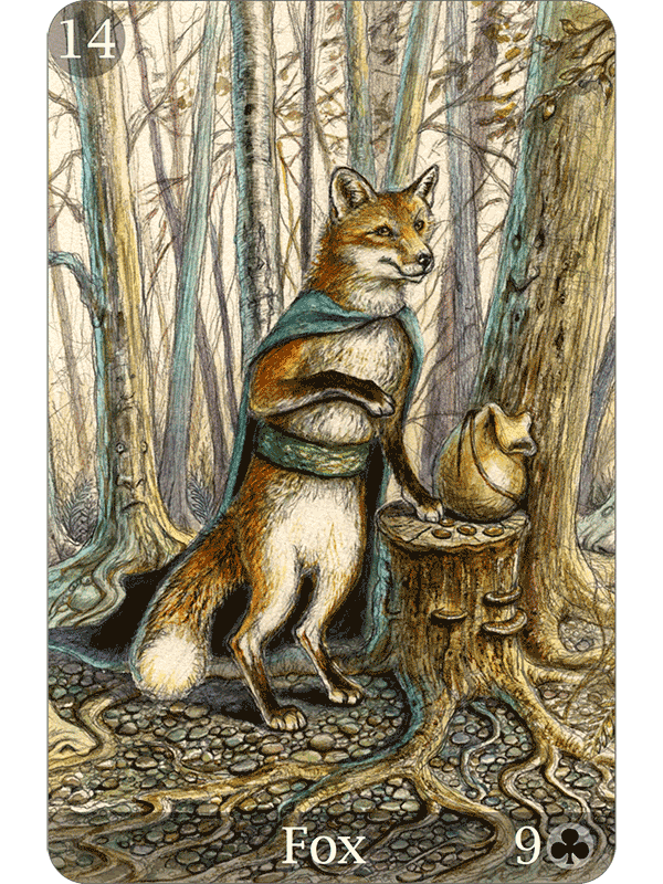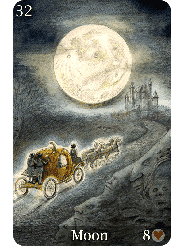 These tales are drawn from Grimm’s Fairytales, The Arabian Nights, Native American legends, and Asian folklore. Each well-chosen myth provides a metaphor illuminating that card’s message, and anchoring the Lenormand images in the universal world of fairy tales.