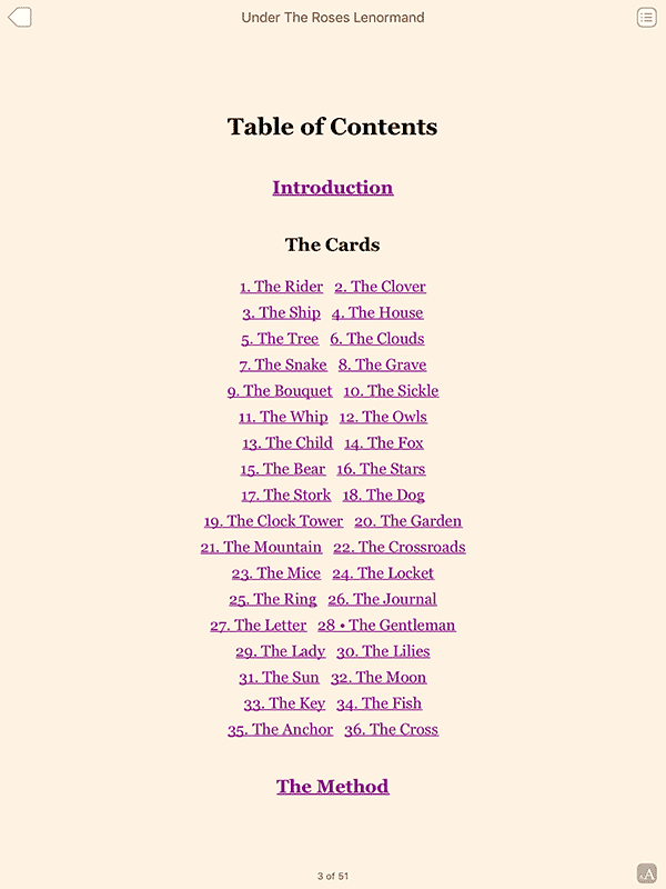 The deck whispers softly, with cards free of distractions, helping the reader to focus. Seasoned readers favor this Lenormand, but the deck’s easy accessibility makes Under the Roses a good choice for beginners, too. The deck remains faithful to Lenormand’s traditional imagery, although several cards have new names. With beautiful roses on many of the 39 cards, Under the Roses is sure to please discerning Lenormand readers everywhere.