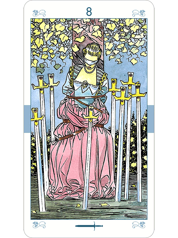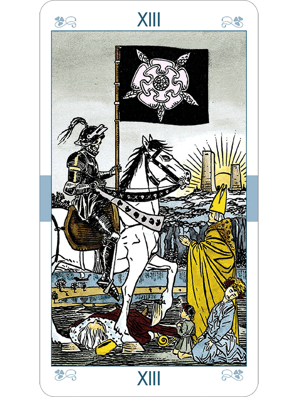 Drawn with Italian flair, the classic scenes are depicted more dynamically, and with sharper focus. The symbolism remains very faithful to the original, but the art is more refined. The deck’s palette of colors is both lighter and brighter than the RWS. Subtle shadings and occasional changes in perspective give the images a more photorealistic appearance. Universal Tarot offers a more polished, sophisticated interpretation of the RWS deck. It is ideal for people who do not like Pamela Colman Smith’s art, but do wish to work with a deck designed to follow RWS very closely.